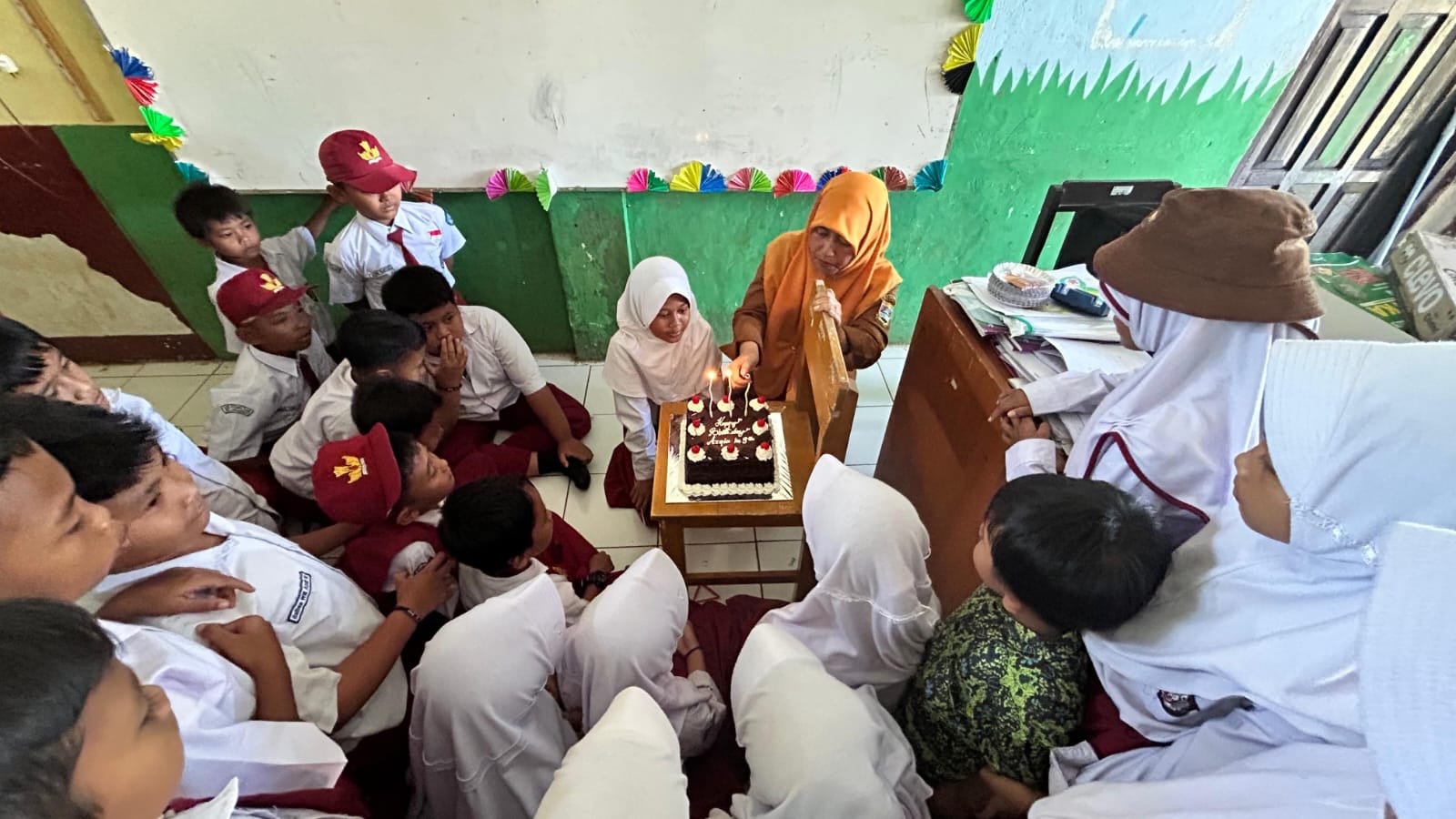 Dalam momen puncak acara, guru Cucu turut hadir mendampingi Azqya saat meniup lilin ulang tahun. Kehadiran Bu Cucu menambah suasana haru dan kebersamaan di tengah teman-teman sekolah yang ikut memberikan semangat dan doa terbaik.