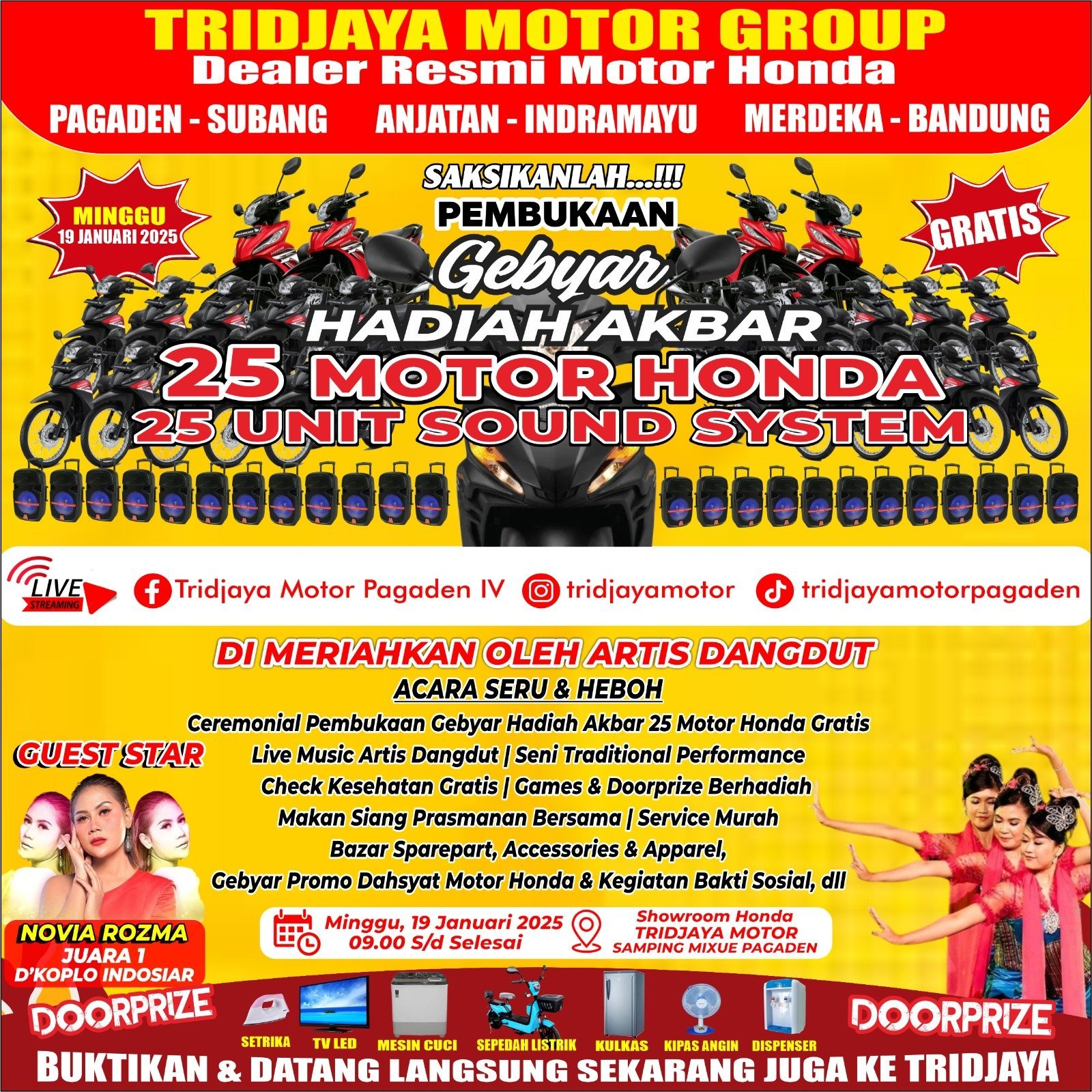 Subang | DETIKKARAWANG | Dealer Tridjaya Motor mengundang anda untuk ikut serta dalam acara Gebyar Undian Akbar ke-25 yang akan dilaksanakan pada hari Minggu, 19 Januari 2025 dimulai sekitar pukul 09.00 WIB Acara ini menjanjikan keseruan dan kejutan menarik bagi seluruh pengunjung.