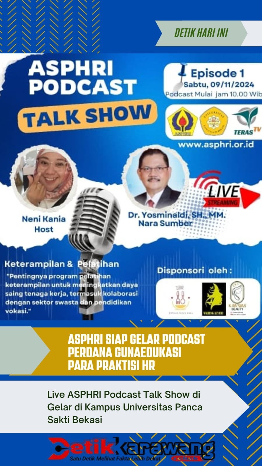 Guna memberikan pelatihan dan keterampilan kepada seluruh anggota yang tergabung dalam Asosiasi HRD terkemuka ini, ASPHRI menggelar acara Podcast dalam bentuk Talk Show dengan mengangkat tema *”Pentingnya program pelatihan untuk meningkatkan daya saing & produktivitas tenaga kerja dan kolaborasi sektor swasta dan dunia pendidikan vokasi”* yang bertempat di sekretariat kampus Universitas Panca Sakti (UPS) Kampus B, Lantai 2, Jl Tegal Danas Kaum, Hegarmukti, Kecamatan Cikarang Pusat Kabupaten Bekasi pada Sabtu 9 November 2024.