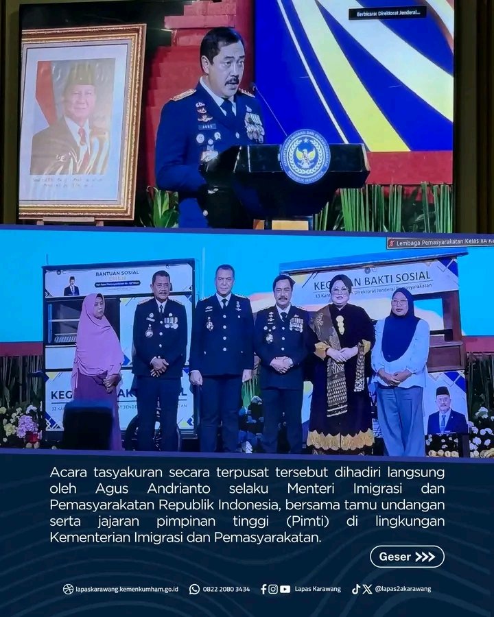 Acara tasyakuran secara terpusat tersebut dihadiri langsung oleh Menteri Imigrasi dan Pemasyarakatan, Agus Andrianto, bersama tamu undangan serta jajaran pimpinan tinggi madya (pimti) di lingkungan Kementerian Imigrasi dan Pemasyarakatan.