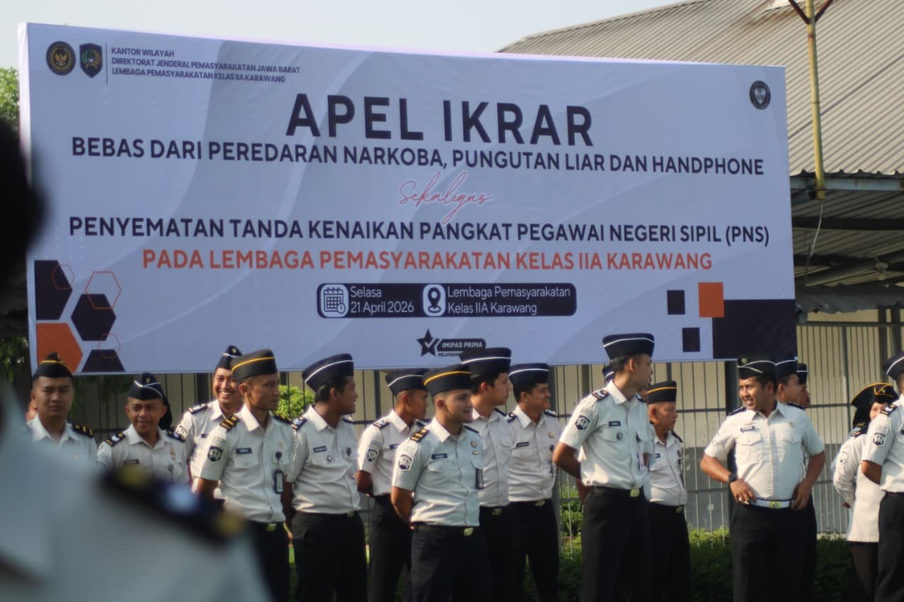 KARAWANG | DETIKKARAWANG.COM | Lembaga Pemasyarakatan (Lapas) Karawang menggelar Apel Ikrar Bebas dari peredaran narkoba, pungutan liar (pungli), dan handphone, yang dirangkaikan dengan penyematan tanda kenaikan pangkat bagi Pegawai Negeri Sipil (PNS), Selasa (21/4/2026).