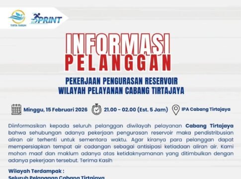 Informasi resmi yang disampaikan manajemen menyebutkan, pekerjaan pengurasan akan dilaksanakan pada Minggu, 15 Februari 2026, mulai pukul 21.00 WIB hingga 02.00 WIB (estimasi lima jam), berlokasi di Instalasi Pengolahan Air (IPA) Cabang Tirtajaya.